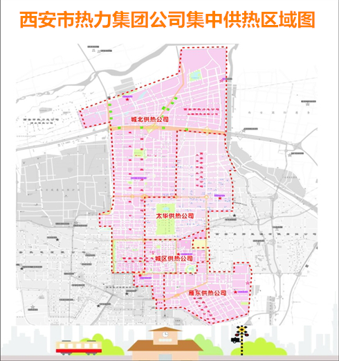 西安市热力集团供热覆盖西安市城市中心区、城北地区、城东南地区、城东北地区、高陵区、草堂、泾渭工业园以及阎良航空产业基地的集中供热。
